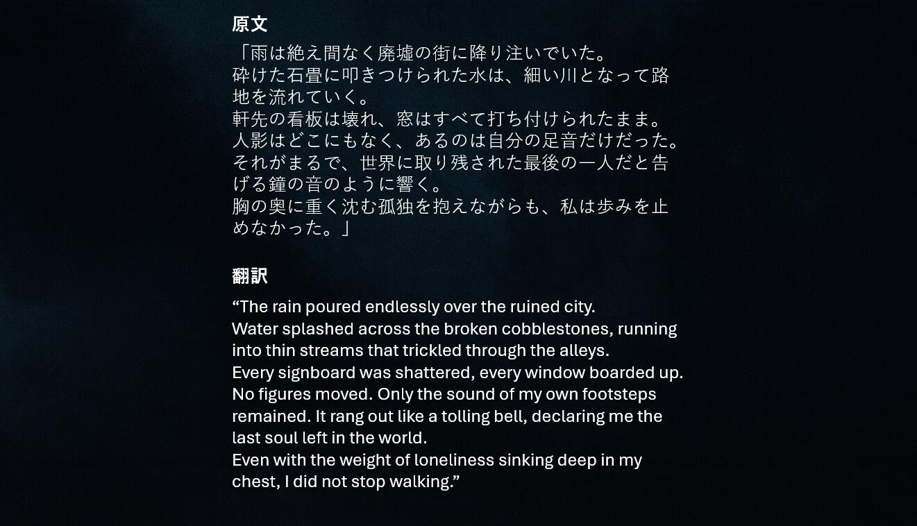 実際に日本の「小説家になろう」で作品を発表し、自作小説 Messiah of Steel はすでに数千人の読者に読まれ、海外向け公開も予定しています。だからこそ、作者が物語のリズムや文体をどれほど大切にしているかを理解しています。